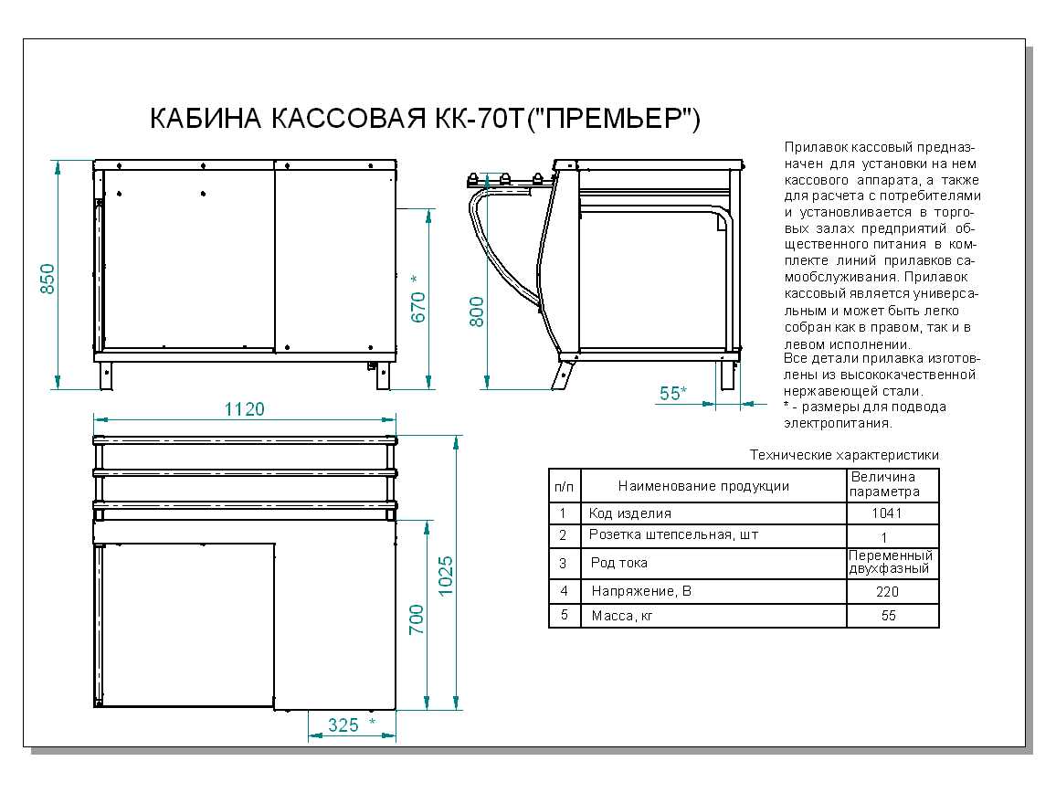 Кассовая кабина выполнена из нержавеющей стали, оснащена направляющими для подноса. Прилавок выполнен в правом исполнении, но может устанавливаться и слева от линии раздачи самообслуживания, путем несложного монтажа. Оборудована одной штепсельной розеткой и дополнительной полкой. Регулируемые по высоте ножки компенсируют неровности на установочной поверхности.