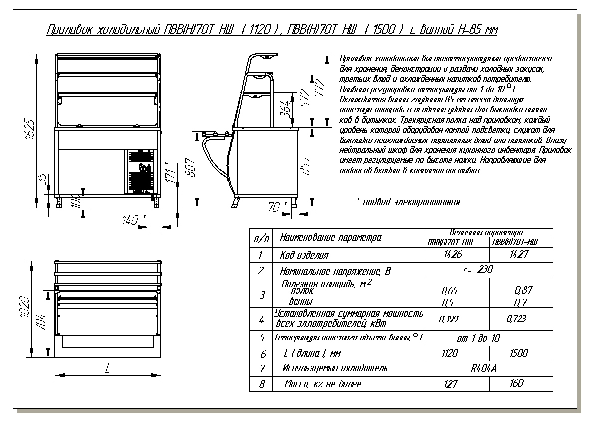 Стол выполнен из нержавеющей стали. Охлаждаемая ванна глубиной 85 мм, закрывается прозрачной дверцей в передней части прилавка. Плавная регулировка температуры полезного объема витрины от 1 до 10°С. Три яруса полок над прилавком (две из которых стеклянные) служат для выкладки неохлаждаемых порций блюд и напитков. Встроенные лампы подсветки под каждой из полок. В нижней части стола находится открытый нейтральный шкаф для хранения кухонных принадлежностей. В комплектацию прилавка входят направляющие для подносов. Ножки стола регулируются по высоте.